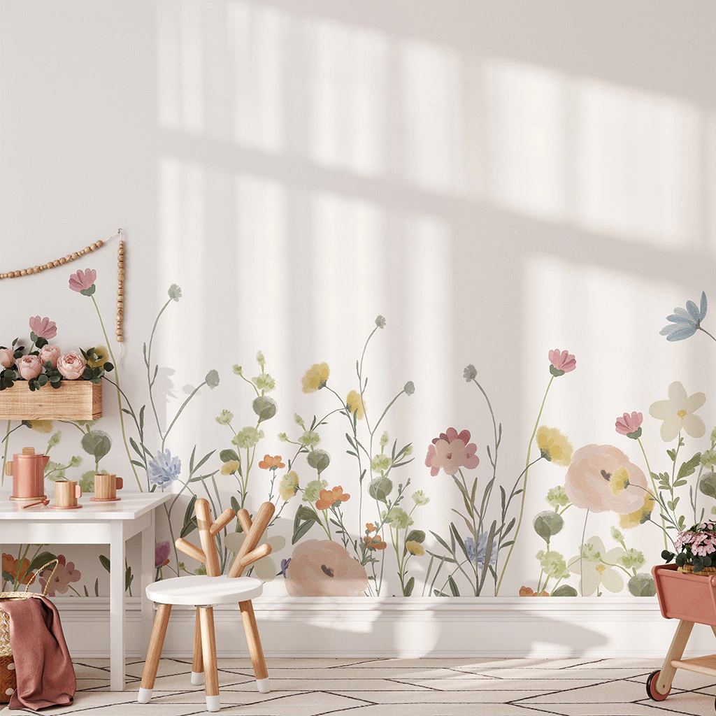 O papel de parede transforma o visual de um espaço em um instante. Inspirado pelas flores e suas cores vibrantes, nosso design Sunny Field é um convite de alegria e energia.